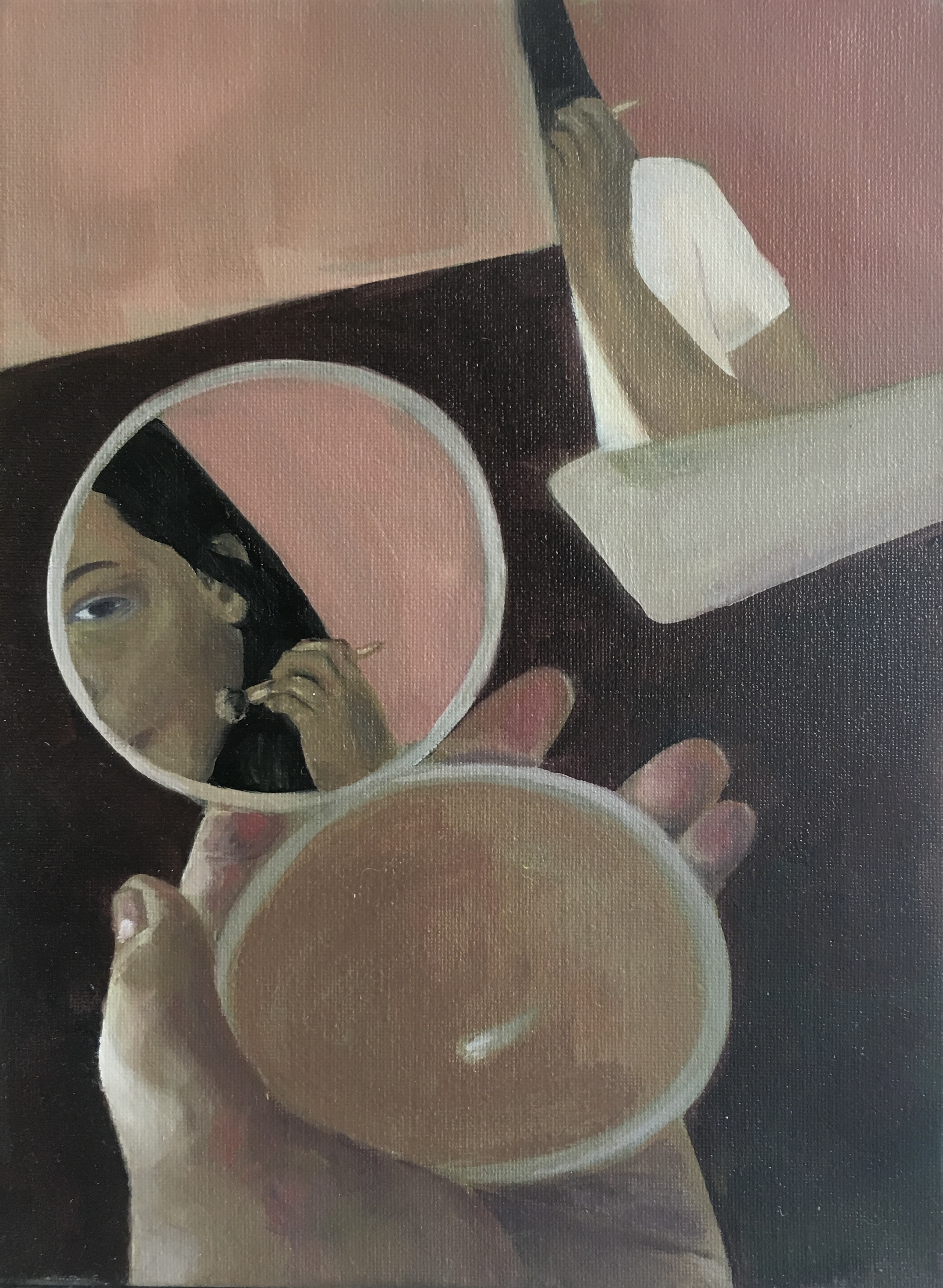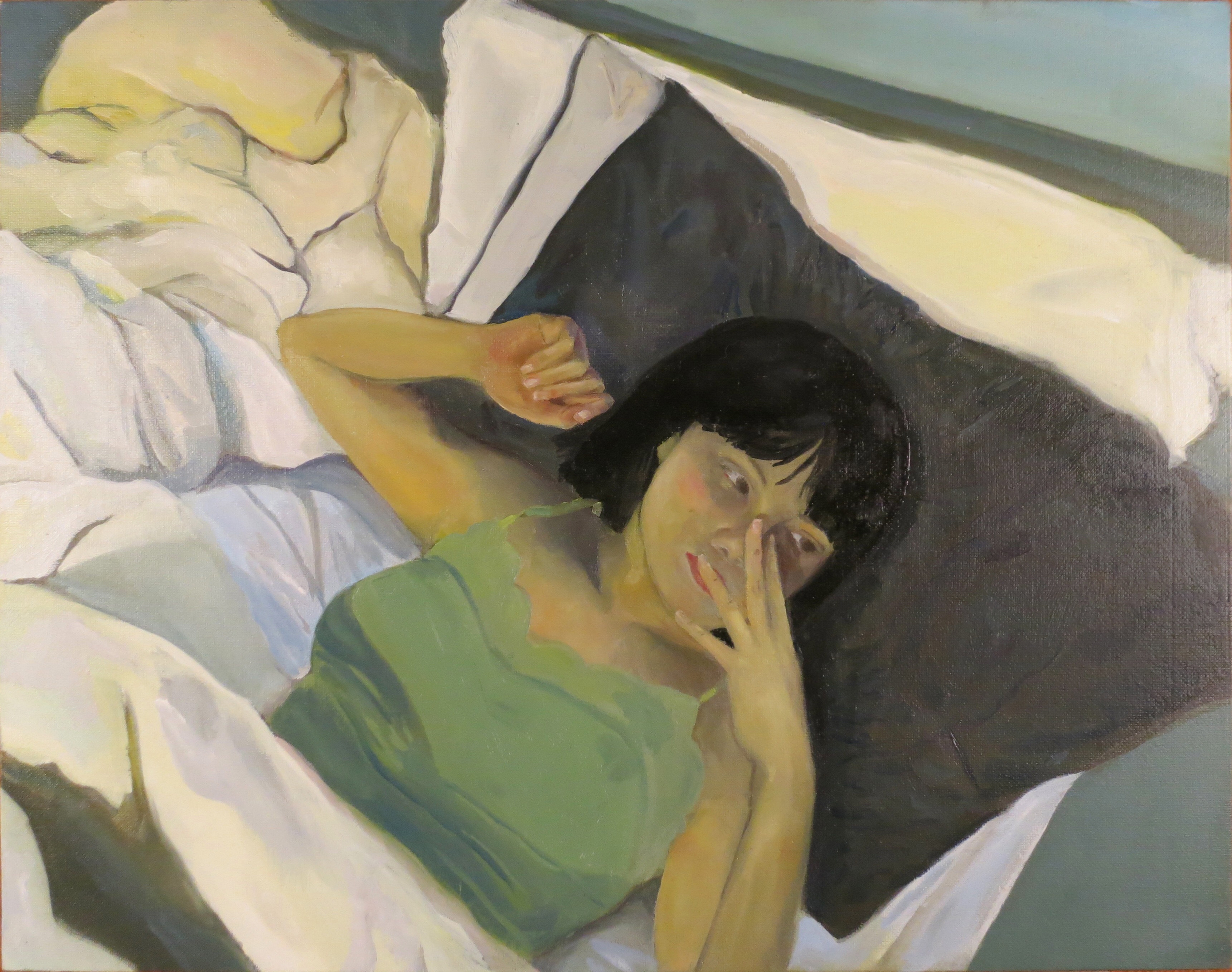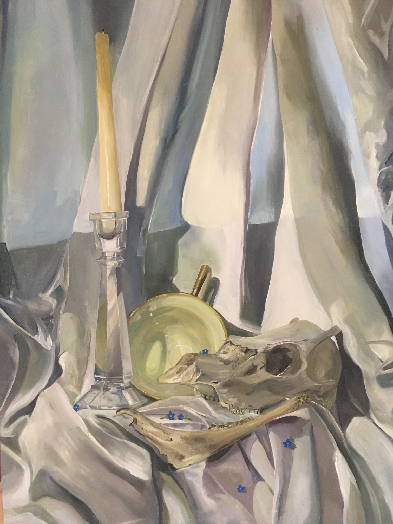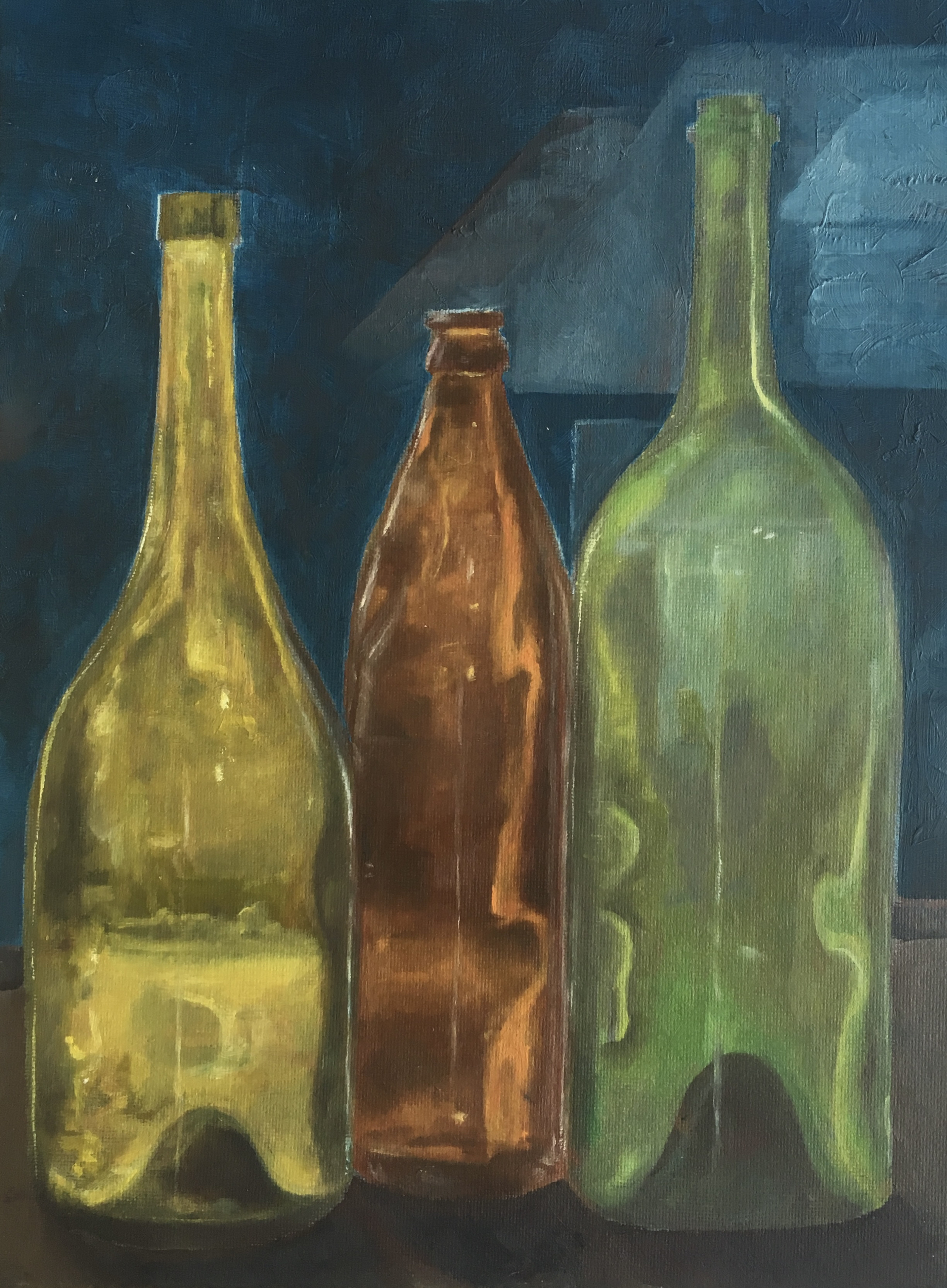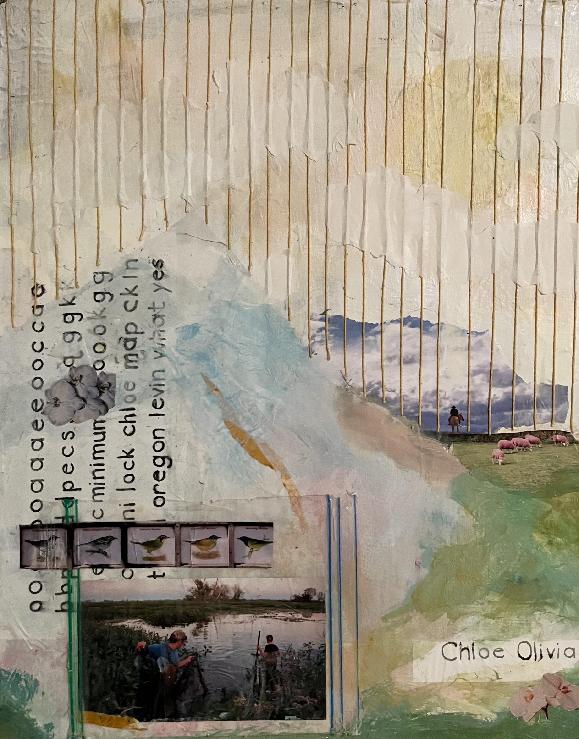 Acrylic paint, yarn, magazine photos, plastic bag, tissue paper